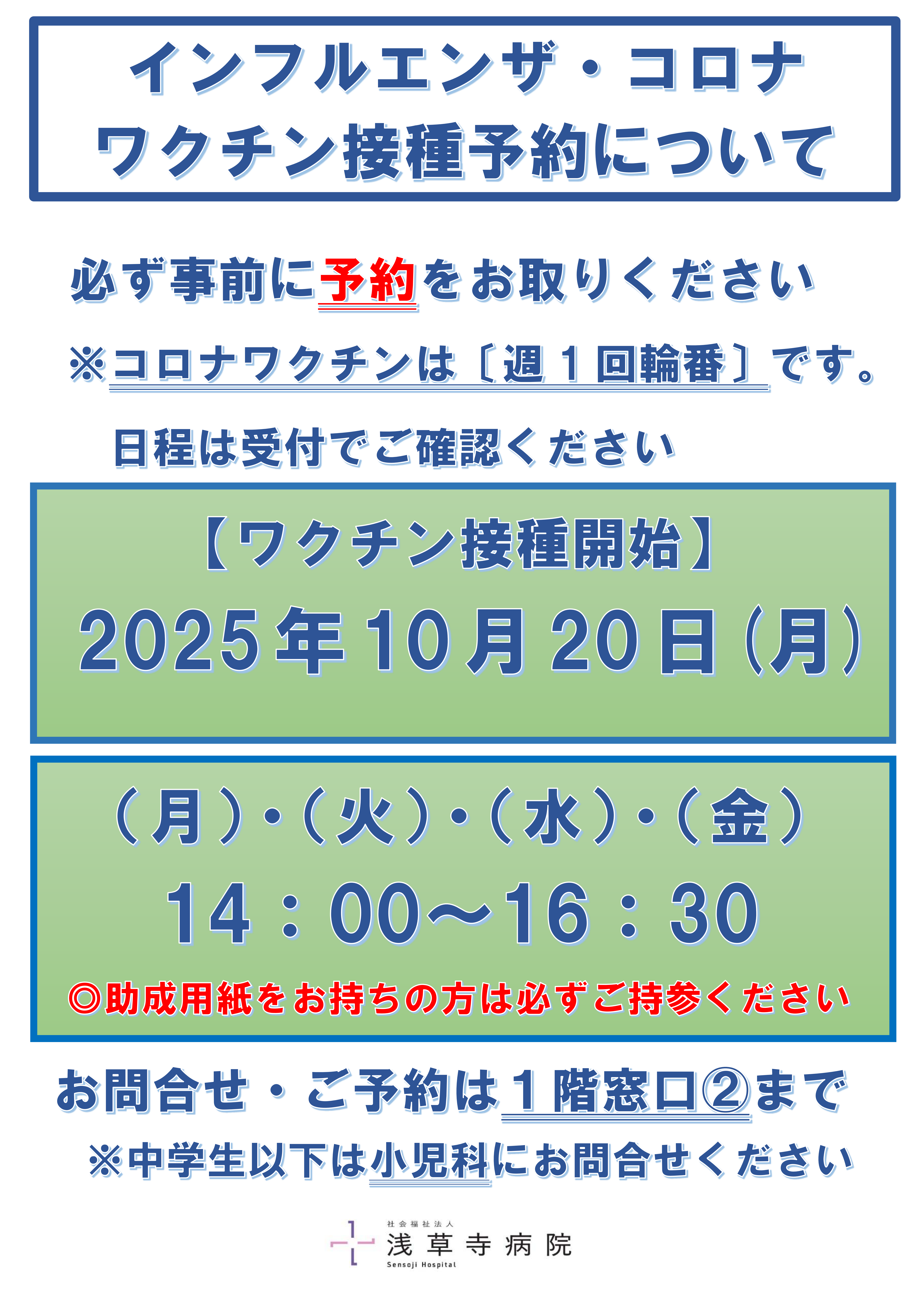 インフルエンザ・コロナワクチンのご予約は令和7年10月1日から開始します。